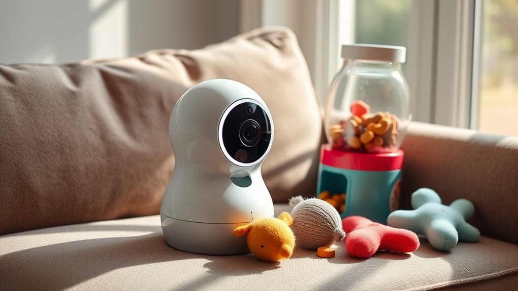 When selecting a pet camera with a treat dispenser, auto-tracking and coverage features play a essential role in ensuring your pet stays monitored and engaged. Auto-tracking technology allows the camera to follow your pet’s movements automatically, so you don’t have to manually adjust the view. With 360° coverage, blind spots are minimized, giving you a complete view of the room or play area. Many cameras use AI algorithms to distinguish pets from other moving objects, reducing false alerts. The effectiveness of auto-tracking depends on the camera’s speed and accuracy in responding to motion and sounds. Cameras with wider lenses and smart auto-tracking help monitor multiple pets or larger spaces, making sure your furry friend is always in sight and entertained.