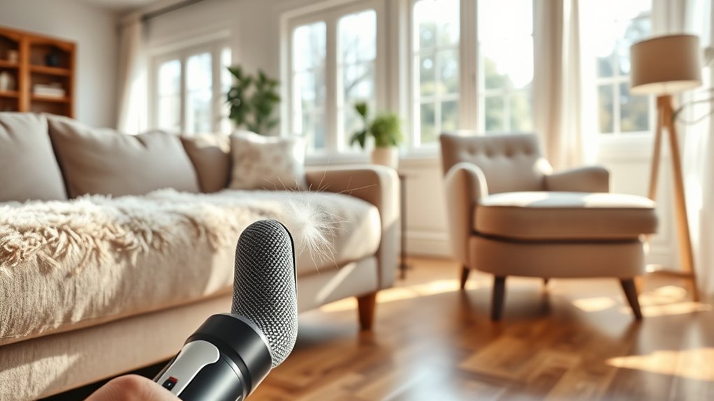 Selecting a pet hair remover that’s easy to use can make a big difference in your cleaning routine. I look for tools with ergonomic designs that reduce arm fatigue, especially when cleaning large furniture surfaces. Simple, intuitive options like rolling brushes or static electricity attract hair effortlessly, making the process smoother. Reusable devices that don’t require constant refilling or extensive cleaning save me time and hassle. Lightweight tools are a must, especially for extended use or cleaning multiple pieces of furniture. Additionally, features like long handles or extended reach designs help me access hard-to-reach areas without awkward bending or stretching. Overall, easy-to-use pet hair removers make regular cleaning less of a chore and ensure I stay on top of pet hair buildup without frustration.