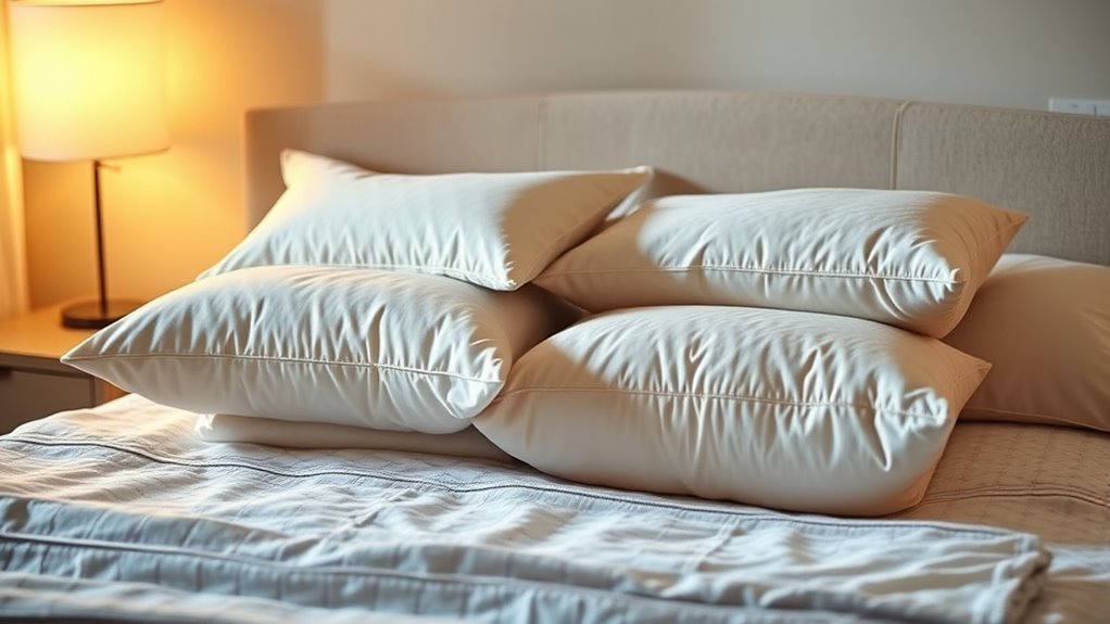 Choosing the right pillow support level is essential for alleviating neck pain, and it largely depends on your sleep position. Side sleepers typically need firmer, higher support to keep the neck aligned with the spine, while stomach sleepers require softer, lower support to prevent neck strain. A pillow that maintains proper cervical curvature reduces muscle tension and prevents aggravation of pain. Adjustable pillows are ideal because they let you customize support height and firmness, ensuring optimal alignment. Be cautious—soft pillows that cause your head to sink can misalign your spine, increasing discomfort. Conversely, overly firm pillows might create pressure points. The goal is to find a support level that promotes spinal alignment from your head through your neck and shoulders, helping you wake up refreshed and pain-free.