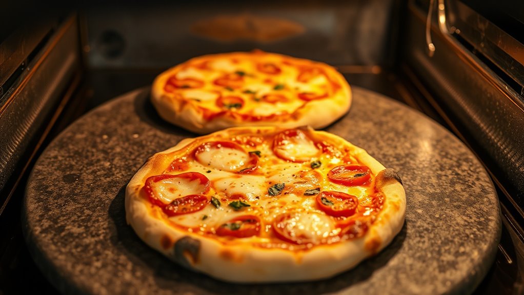 Preheating your pizza stone properly is key to achieving that perfect, crispy crust. Most stones need at least 30 to 60 minutes of preheating to guarantee even heat distribution, which is essential for restaurant-quality results. Thicker stones usually require longer preheating times compared to thinner ones to reach the ideal temperature. Proper preheating also helps prevent cracking caused by thermal shock when placing cold dough onto a hot surface. While some stones are designed for rapid heating and cooling, it’s still best to gradually preheat them to extend their lifespan. Skipping or rushing this step can lead to soggy crusts or uneven baking, ruining your pizza’s texture and flavor. Taking the time to preheat is a small effort for a big payoff.