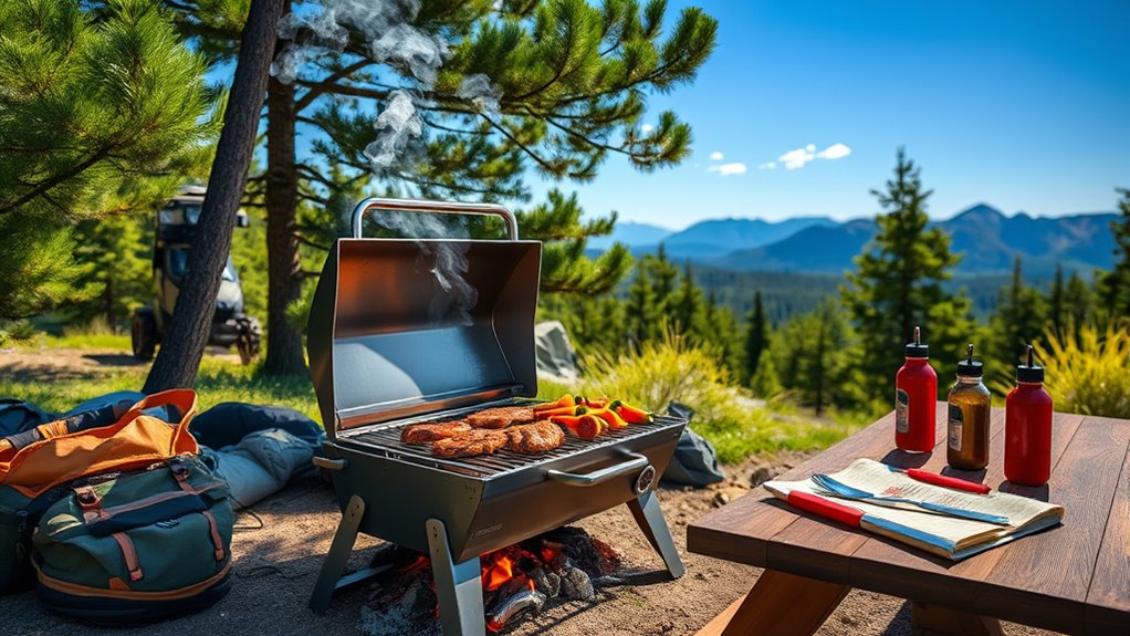 Did you know that nearly 60% of campers prefer versatile grills? Absolutely, portable grills can be used for indirect cooking and smoking. I love using mine for slow-cooked briskets or smoky ribs, which enhances flavor and tenderness. You just need to adjust the heat settings, use a two-zone setup, or add a smoker box if available. It’s a game-changer for outdoor cooking, making your camping meals even more delicious!