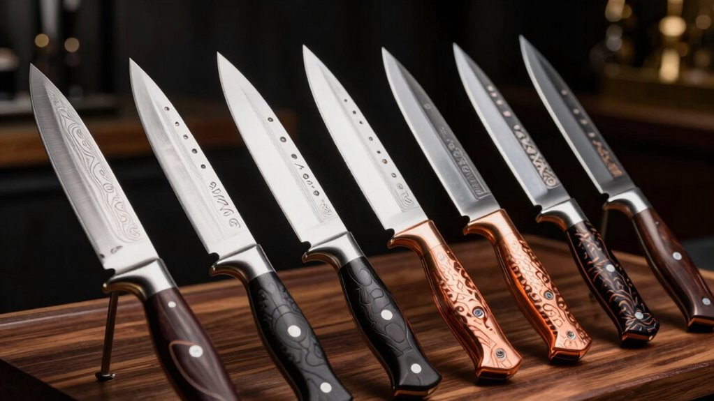 Since premium knives over $500 are made from high-quality steels like VG-10, SG2, or CPM S90V, maintaining their edge and preventing corrosion requires careful attention. Regular honing keeps the edge sharp, while hand washing avoids damage from dishwasher chemicals or harsh abrasives. Many of these knives undergo advanced heat treatments, like cryogenic processes, boosting their durability and lifespan. The handle material also plays a role; stabilized wood, titanium, or carbon fiber resists moisture and temperature changes, ensuring long-term resilience. Proper storage, such as blade guards, sheaths, or dedicated blocks, protects against accidental damage and preserves their appearance. Investing in good maintenance routines and protective accessories is key to maximizing the performance and longevity of these high-end tools.