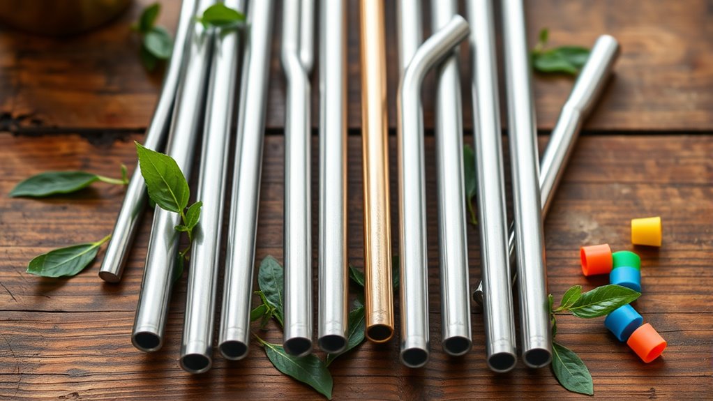Choosing stainless steel straws over single-use plastics can make a real difference in reducing environmental harm. Each stainless steel straw can replace hundreds of disposable plastic ones, markedly cutting down plastic waste. This shift also reduces the environmental impact linked to plastic production, disposal, and pollution in oceans and landfills. Stainless steel is durable and long-lasting, meaning fewer replacements are needed, which conserves resources. Supporting reusable straws helps lower the demand for single-use plastics, contributing to a smaller carbon footprint. To maximize these benefits, proper cleaning and maintenance are essential, ensuring the straws last longer and waste is minimized. Overall, choosing stainless steel straws aligns with sustainable practices and helps protect our planet for future generations.