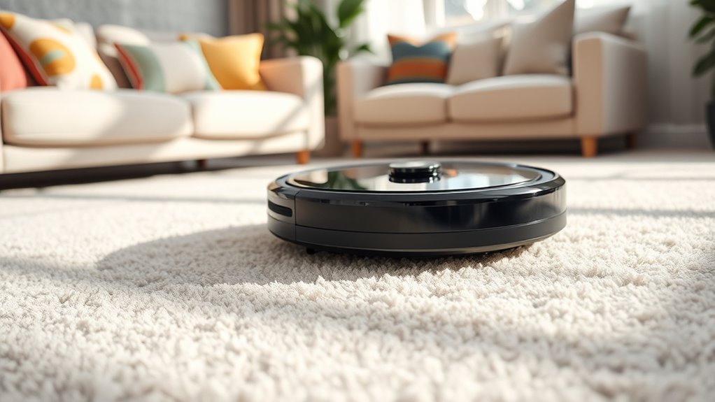 Choosing a robot vacuum for pet hair means paying close attention to how easy it is to maintain. A self-cleaning brushroll is a game-changer, preventing hair tangles and reducing manual effort. Washable filters and dustbins simplify ongoing upkeep, saving you money and time on replacements. Models with automatic hair removal and tangle-free suction ports help keep performance consistent without constant intervention. Extended battery life and self-emptying bases decrease how often you need to empty or recharge, making maintenance less of a hassle. Additionally, easy-to-access, washable components and straightforward cleaning routines make pet hair cleanup more convenient. Overall, a vacuum designed with maintenance ease in mind ensures you spend less time on upkeep and more time enjoying a fur-free home.