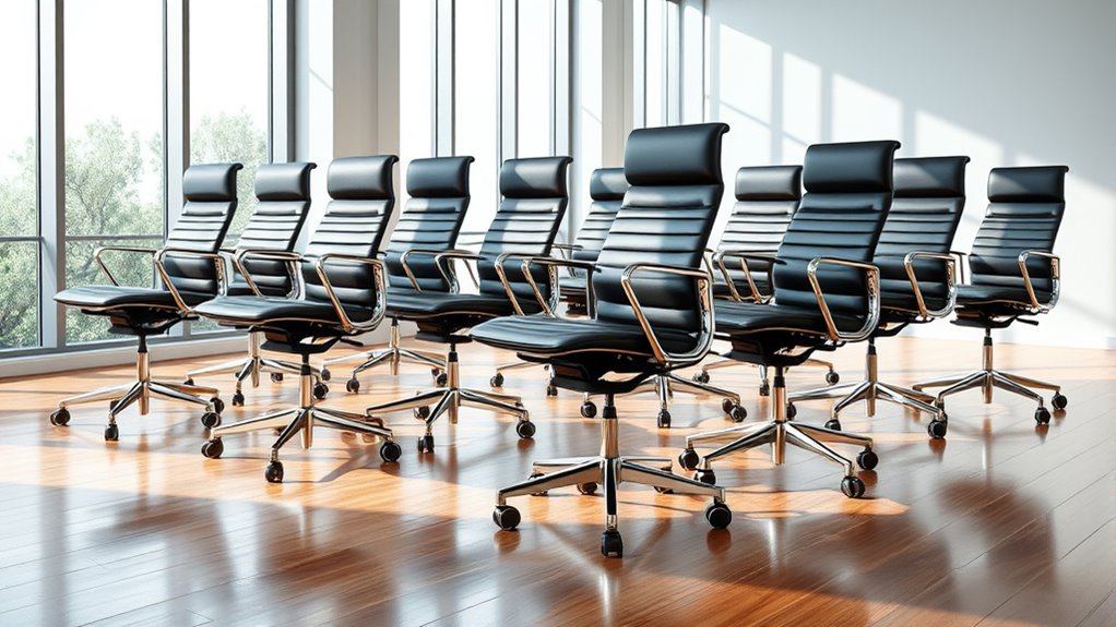 Choosing the right casters is vital for guaranteeing smooth mobility and stability in a rolling office chair. High-quality casters, like nylon or polyurethane wheels, glide easily and minimize floor damage. Swivel casters that rotate 360 degrees make maneuvering effortless, letting you change directions without lifting the chair. The size and material of the casters matter: larger, rubber-coated wheels work best on hard floors, while smaller plastic ones suit carpets. Locking casters add safety by keeping the chair stationary when needed, preventing unwanted movement. Durability and weight capacity are also essential; strong casters support heavier users and resist wear over time, maintaining mobility. Overall, choosing the right casters ensures your chair moves smoothly and stays stable during use.