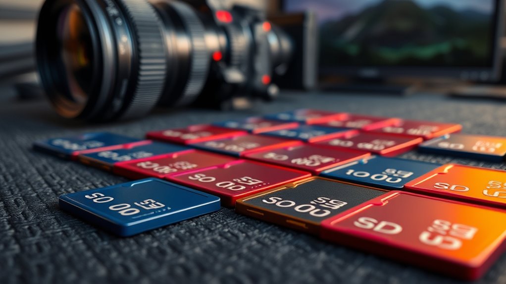 Choosing an SD card with the right speed class rating is essential to guarantee smooth 4K video recording. These ratings, like UHS Speed Class 3 (U3) and Video Speed Class 30 (V30), indicate the minimum sustained write speeds needed for reliable footage. U3 ensures at least 30MB/s, preventing buffering and dropped frames during recording. V30 also guarantees 30MB/s, specifically optimized for high-quality video. Higher ratings such as V60 or V90 provide even faster speeds (60MB/s and 90MB/s), suitable for higher bitrate 4K or 8K videos. Selecting an SD card with an appropriate speed class ensures consistent performance, enabling seamless recording without interruptions. This choice is critical for capturing professional-quality footage and avoiding any recording issues caused by insufficient write speeds.