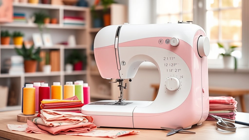 Choosing a sewing machine that offers the best features for your budget is essential to get started without overspending. I recommend balancing affordability with key functions, so you get value without sacrificing quality. Look for models that include necessary accessories like multiple stitches and user-friendly guides—these maximize your investment. It’s also wise to contemplate durability; cheaper machines might not last long, while slightly pricier options often provide better longevity and performance. Machines with adjustable stitch length and width, or multiple stitch patterns, tend to give more room for growth and creativity. Always check reviews and ratings to ensure the machine is reliable and cost-effective, offering good performance relative to its price. This way, you’ll find a machine that’s both budget-friendly and capable.
