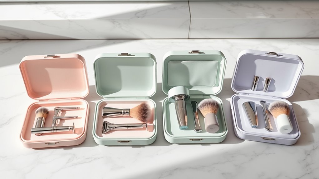 Choosing a shaving kit that’s portable and easy to store can make a big difference in my grooming routine, especially when I’m traveling or short on space. Compact kits with travel cases or magnetic holders are perfect for keeping everything organized and easy to carry. I prefer lightweight designs, usually under 200 grams, because they’re easier to handle and won’t weigh down my bag. Waterproof and wet/dry features are a bonus, allowing me to use and rinse my tools in the shower without worry. Modular kits with detachable attachments and foldable handles help save space and keep my tools organized. Clear, durable cases with secure closures ensure everything stays hygienic and prevents loss, which is essential when I’m on the go or sharing bathroom space.