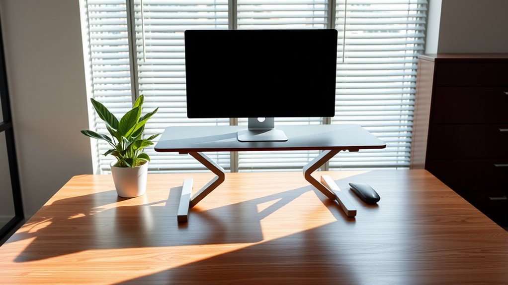 Adding extra features to a standing desk converter can substantially boost both convenience and workspace organization. USB charging ports and cable management grommets keep cords tidy, reducing clutter and making setup simpler. Programmable height memory settings let me quickly switch between ergonomic positions, saving time and improving comfort during long work sessions. Digital displays or LED indicators help me make precise height adjustments by providing real-time feedback. Some models even connect to apps or health tracking tools, encouraging healthier habits and ergonomic awareness. Surface protectors or felt pads prevent scratches and damage when adjusting the height or placing heavy equipment. These features not only enhance functionality but also create a cleaner, more efficient workspace, making my daily work routine smoother and more enjoyable.