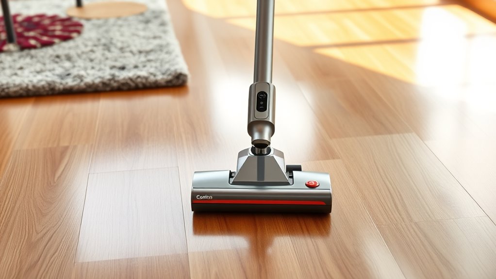 Choosing a vacuum that cares for my hardwood floors means paying attention to features that prevent damage during cleaning. I look for models with a brushroll that can be turned off, so I avoid scratching or gouging delicate surfaces. Soft, rubberized wheels are essential—they glide smoothly without leaving marks or gouges. Adjustable height settings help me ensure gentle contact with the floor, preventing excessive pressure. I also prefer vacuums with multi-surface or bare floor modes that clean effectively while minimizing abrasive contact. HEPA filters and sealed systems are a bonus, trapping fine dust and allergens without stirring up debris that could scratch or damage the surface. These features help me keep my hardwood floors spotless without compromising their finish or integrity.
