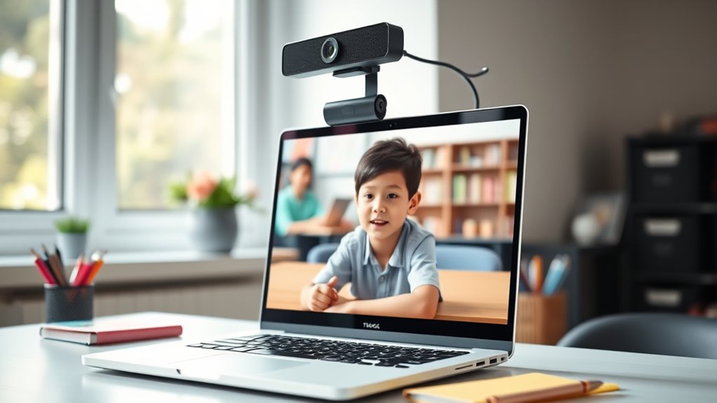 Choosing the right webcam for online classes hinges on several essential video quality standards. First, I look for at least 1080p full HD resolution to ensure sharp, clear images that make a good impression. Frame rates of 30fps or higher are crucial for smooth motion during lessons, preventing choppy video. Low-light correction features help maintain clarity in varied lighting conditions, avoiding grainy or dark visuals. Wide-angle lenses, around 90° to 110°, allow me to capture more of my surroundings, which is helpful for group discussions or classroom setups. Autofocus is also vital, ensuring consistent sharpness even if I move or shift position. These standards collectively guarantee a high-quality streaming experience that keeps students engaged and makes online learning more effective.