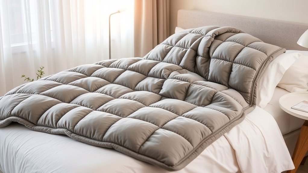 The right size and weight of a weighted blanket are important, but staying comfortable throughout the night also depends on how well it manages temperature. Breathable fabrics like cotton, bamboo, or microfiber help regulate heat by promoting airflow and moisture-wicking, keeping you cool and dry. Incorporating cooling materials such as glass beads or phase-change fabrics can further enhance heat dissipation, preventing overheating. Multi-layer designs with ventilated or mesh panels improve airflow, maintaining a consistent body temperature. The fabric’s thickness and density also matter: lighter materials suit warm climates, while thicker fabrics provide warmth in colder environments. Adjustable blankets with removable covers or cooling layers give you the flexibility to customize temperature control based on your comfort and seasonal needs.