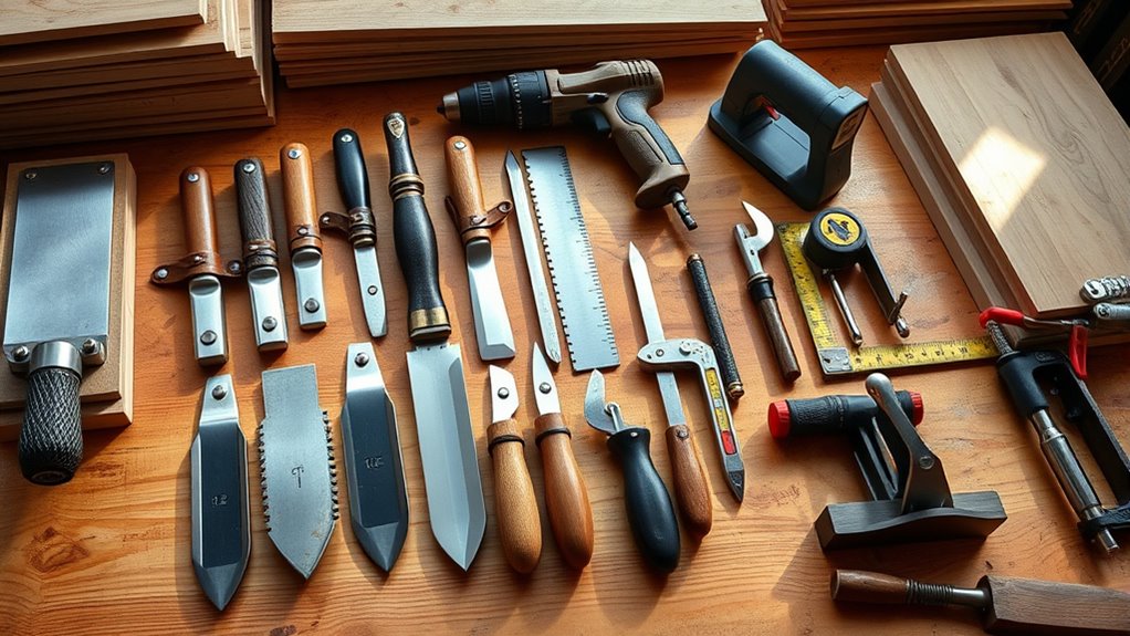 To set up a great woodworking workshop, I recommend tools like high-quality saws, drills, and shaping instruments, along with essential measuring and marking devices. Clamps, specialty tools, and work surface solutions help maintain precision and safety. Power tools and safety gear are also must-haves for efficiency and protection. If you keep exploring, you’ll discover the best options to match your projects and budget for a truly equipped workshop.